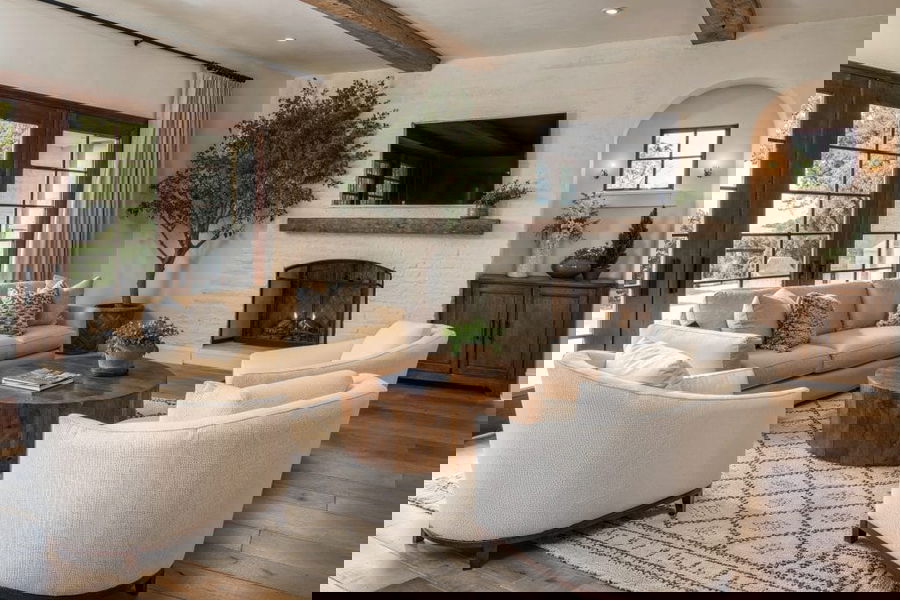 Furniture choices reinforce the room’s relaxed yet tailored feel. A large, modular sofa in a soft, neutral fabric anchors the seating area, positioned to make the most of the fireplace and outdoor views. Complementing this, a pair of cozy armchairs with their rounded shapes soften the otherwise clean-lined design. The coffee table, with its simple, blocky structure, ties into the room’s natural textures, maintaining the overall sense of organically-driven calm.