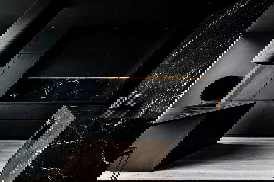 8. Tamsios ir dramatiškos modernios juodos virtuvės spintelės