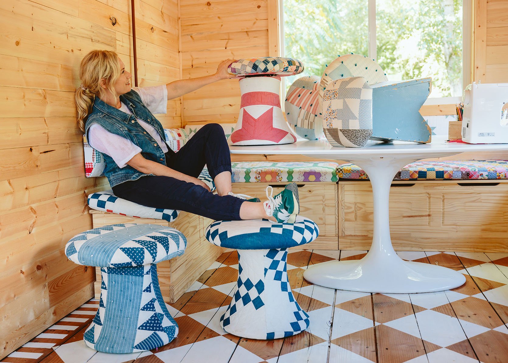 Šis projektas man buvo didžiulė serotonino dozė – matydama šias nuotraukas apima toks pat jaudulio pliūpsnis, kaip mano vaikai, valgydami sekmadienio saulėgrąžas. Jaučiasi cheminis, tikrai. Bėgant metams pademonstravau daug kaupimo tendencijų – stilistu netapsi be ypatingos meilės „daiktams“. Senovinės antklodės visada buvo kažkas, ką leisdavau sau nusipirkti, net jei „man to nereikėjo“ (vintažinis audinys paprastai yra tame sąraše, TBH). Užaugau dygsniuotoje 4-H, todėl žinau, koks darbas, meilė ir laikas tenka visoms antklodėms, ir man tiesiog sunku leisti joms likti sendaikčių parduotuvėje, liūdnoms, išmestoms ir nemylimoms dabartiniame gyvenime. Taigi šiam projektui paėmiau visą savo antklodžių kolekciją iš sendaikčių parduotuvių, Etsy ir sendaikčių turgelių (šiek tiek purslų, keletą centų) ir svajojau iš naujo apmušti visus suoliukus, nugaros pagalvėles ir grybų kėdes šioje amatų troboje (anksčiau vadinta). meno tvartas). Tai gali būti vienas iš mano mėgstamiausių dalykų, kuriuos aš kada nors padariau savo gyvenime. Jei prisimenate mane dėl vieno dalyko, tebūnie šis visiškai nereikalingas (bet jau TAIP NAUDOTAS) fantazijos kambarys 🙂